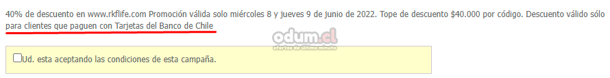 40% de descuento en www.rkflife.com Promoción válida solo miércoles 8 y jueves 9 de junio de 2022. Tope de descuento $40.000 por código. Descuento válido sólo para clientes que paguen con Tarjetas del Banco de Chile
