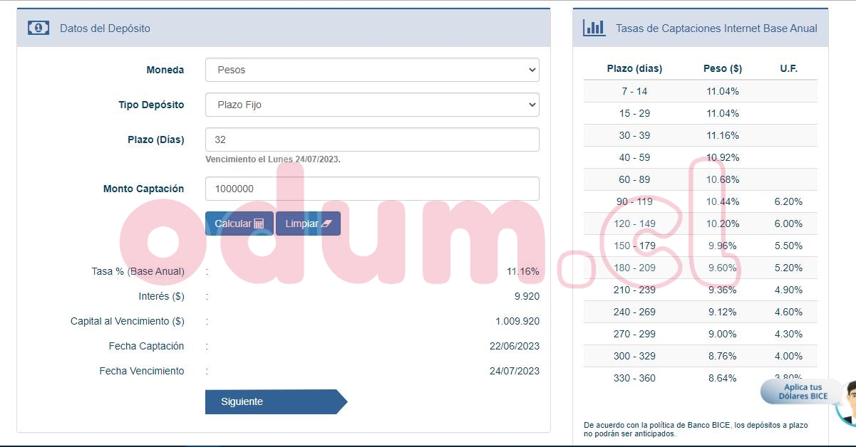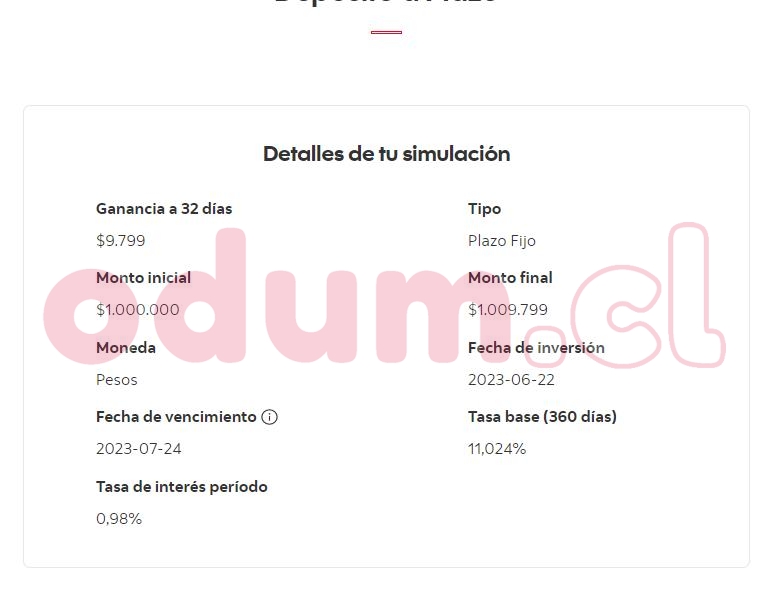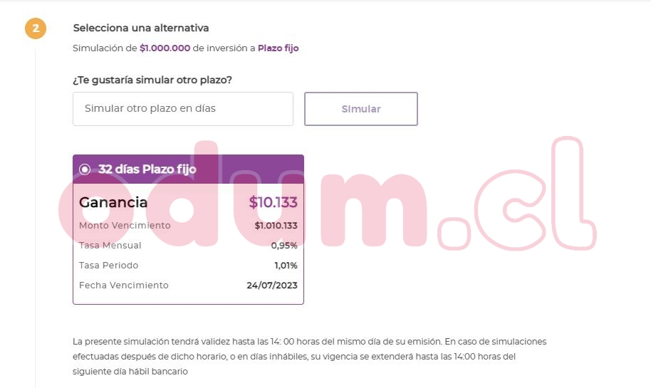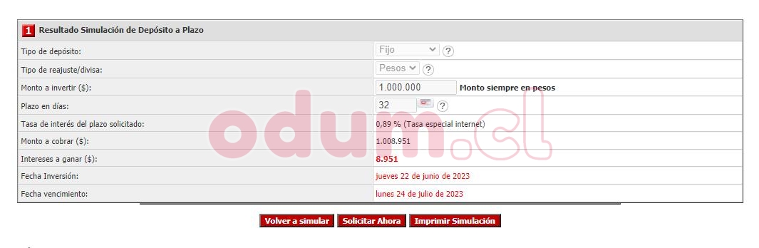 Ejercicio simple simulando un monto de $1.000.000 CLP en 4 bancos a 32 días, con fecha 21/06/2023, deposito seria tomado dia 22/04/23 según la simulación, otros bancos no puedo simular ya que no soy clte.