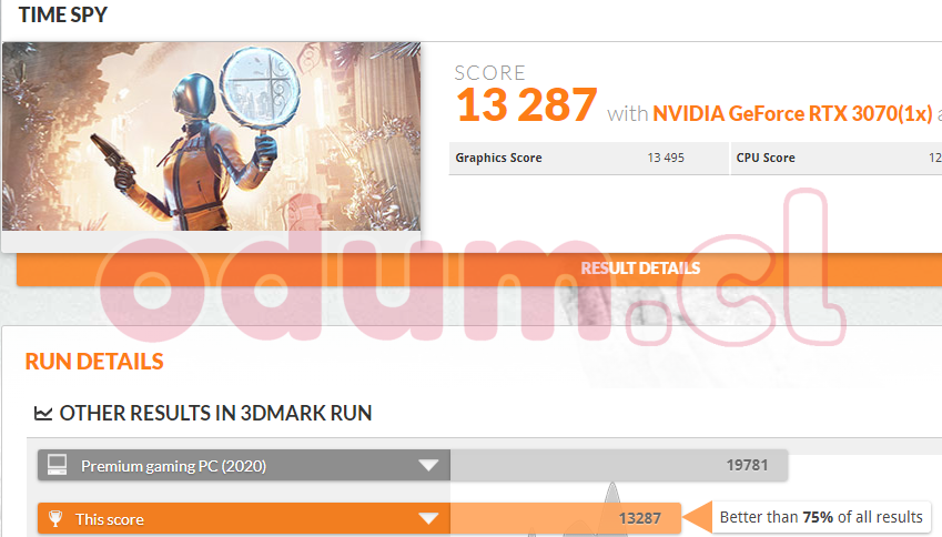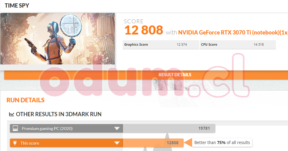 La 3070ti de notebook con TDP de 150w en timespy me ha dado puntajes cercanos a los 12500 y la 3070 de escritorio como mucho da 14000 puntos. (la diferencia en fps al jugar es relativamente poca)