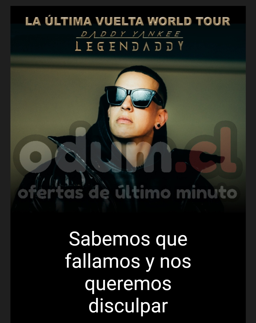 La semana pasada no pudimos cumplir con la preventa exclusiva para el concierto de Daddy Yankee, sabemos que fue un momento frustrante para todos y por eso, te ofrecemos nuestras más sinceras disculpas. Aprendemos de nuestros errores y hoy queremos entregarte una solución que democratiza el acceso, de forma que todos tengan las mismas posibilidades de ser parte de la venta exclusiva de 12.000 entradas para ver al King.