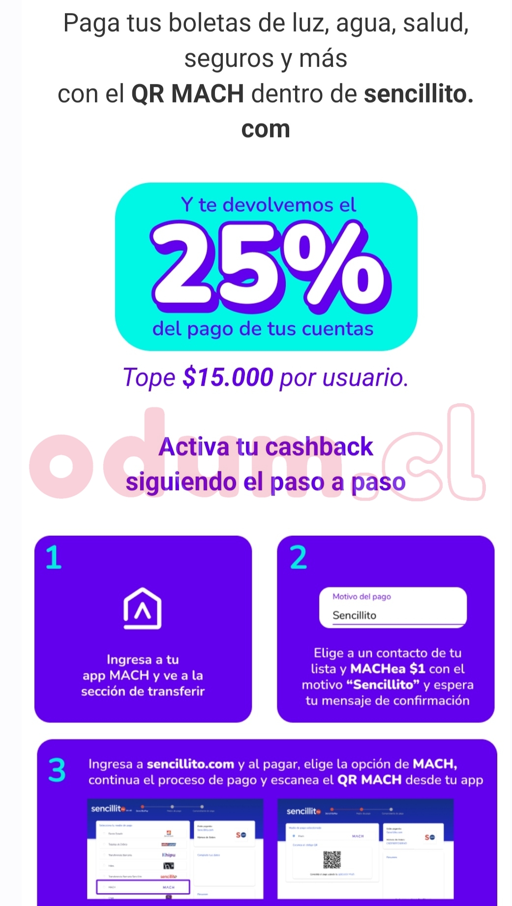 hubo una promo hace poco de 6 lucas d devolución máxima por pago de cuentas, me llegó notificación nomás, quizás no la visteAcabo de pagar 3 cuentas en la app de Mach y me devolvieron 2 lukas por cada una, no me ha llegado ningún correo con la promo siendo que hace unos meses si me había llegado. A alguien más le ha pasado?