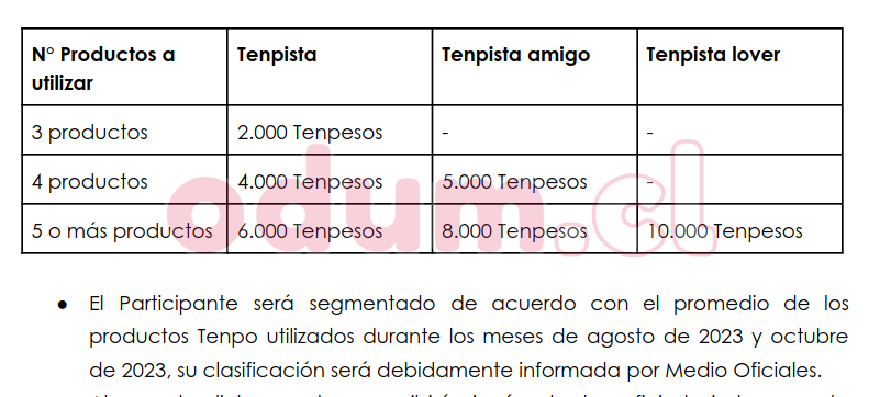 La promo es "Usa más productos y gana más Tenpesos" de https://www.tenpo.cl/bases . Va el extracto de las bases: