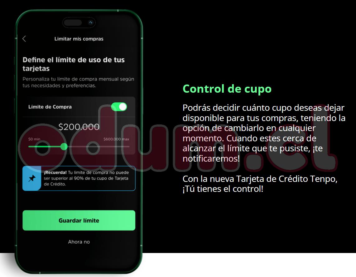 En mi caso, nunca me habian dado tanto cupo como esta credito de Tenpo :ROFLMAO:, tengo mas cupo en ella que en todas las otras tarjetas sumadas.. Después salió la opción de limitar cupo, asi que había puesto el mínimo posible... pero no se puede bajar a lo que uno quiera. Cuando me den el nuevo plastico, pediré que me bajen el cupo total, para poder bajar más el limite que se controla por la app...