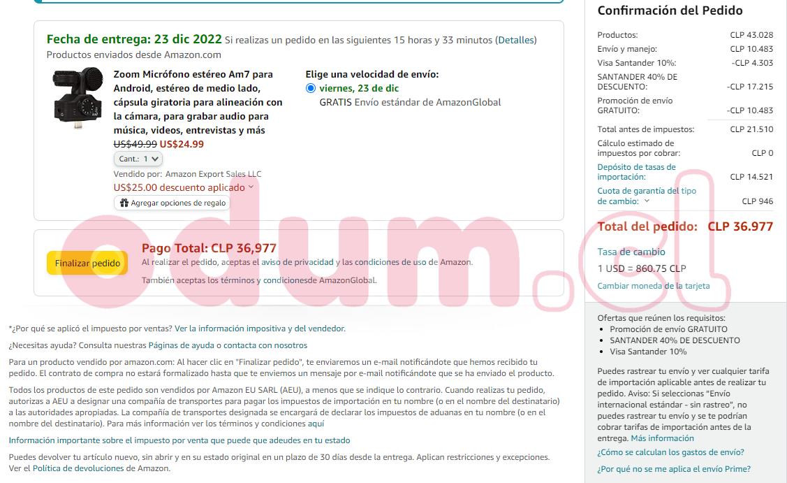4. Pagar el artículo con la "tarjeta santander" pero al momento de cobrar restará saldo del amazon reload